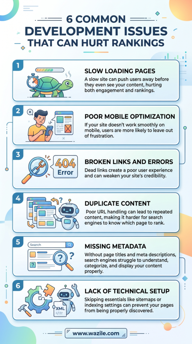 Even visually appealing websites can struggle if certain technical issues are present. Here are some common web development mistakes that hurt SEO: