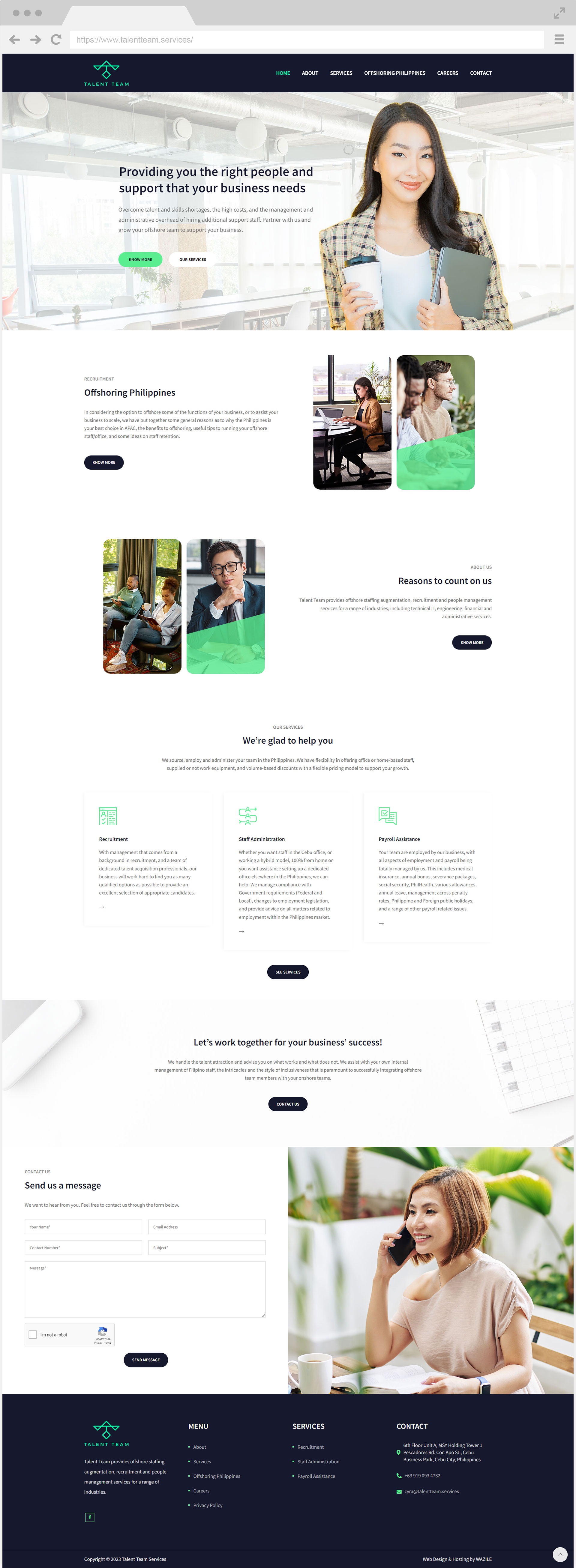 Talent Team Services recognized the need for a strong online presence and brand awareness. We helped them by providing web design services and crafted a responsive and professional website that both old clients and potential clients can visit to learn more about Talent Team’s services online. To ensure that their site is up and running, we included one month of free website maintenance and update services.